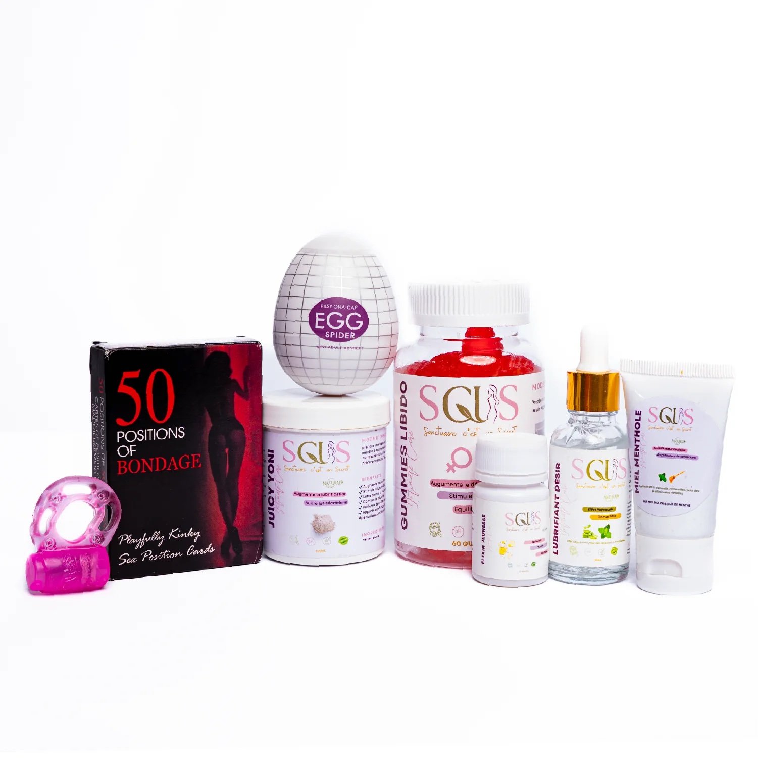 Lubrifiant désir GM, juicy yoni, gummies booster libido, elexir jeunesse, miel mentholé, carte positions, oeuf masturbateur, anneaux vibrants, 7 e ciel